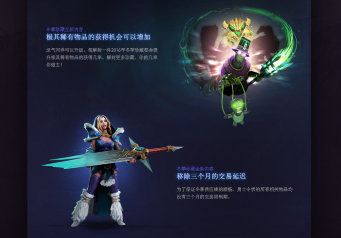 运气同样可以升级。每解封一件2016年冬季珍藏都会提升极其稀有物品的获得几率。解封更多珍藏,你的几率你做主!
