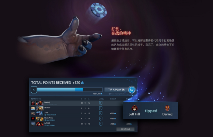 摧毁敌方遗迹后,可以将部分赢得的代币用于打赏稳健的队友或者颇具灵性的对手。别忘了,出众的勇士不论输赢都会很有风度。