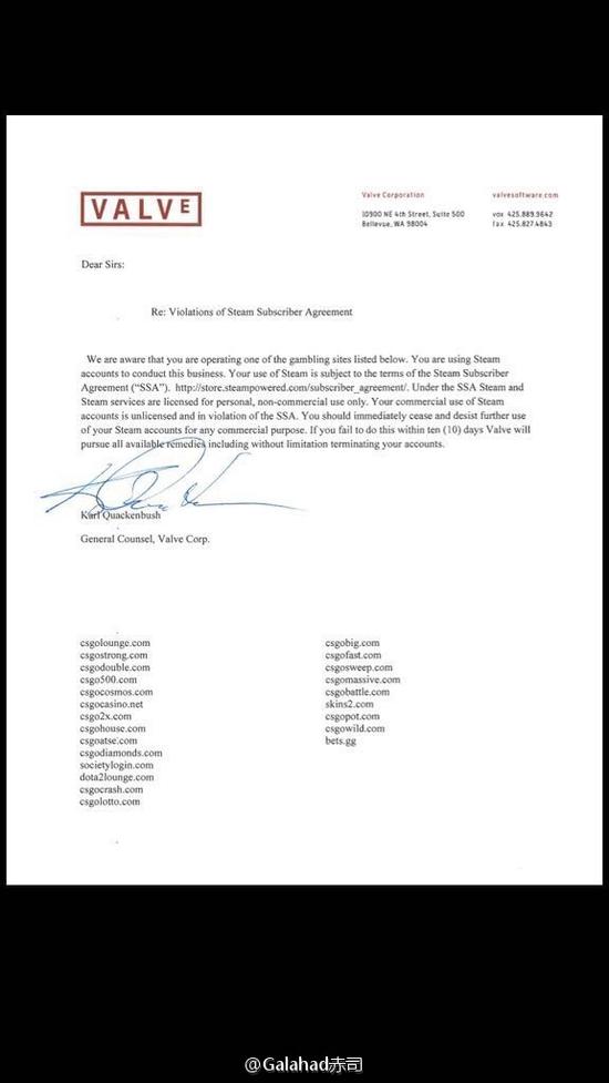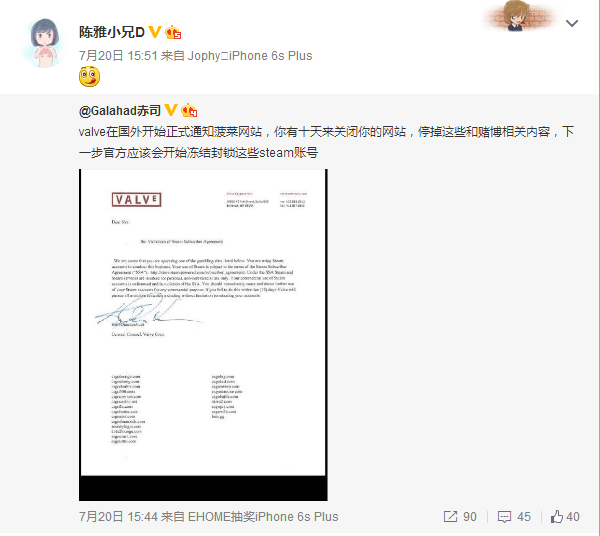 7月20日:一张V社的邮件截图在各大网站流传,邮件中列出了几十家博彩网。valve在国外开始正式通知菠菜网站,你有十天来关闭你的网站,停掉这些和赌博相关内容,下一步官方应该会开始冻结封锁这些steam账号。