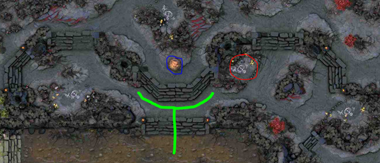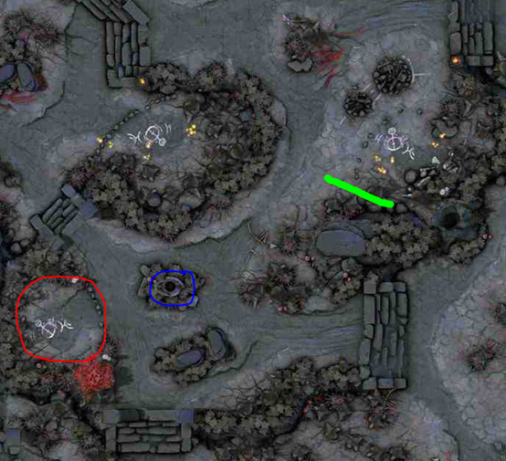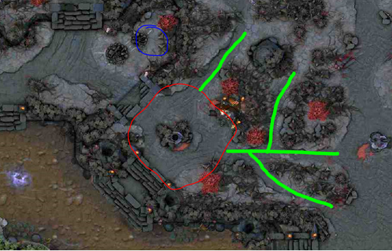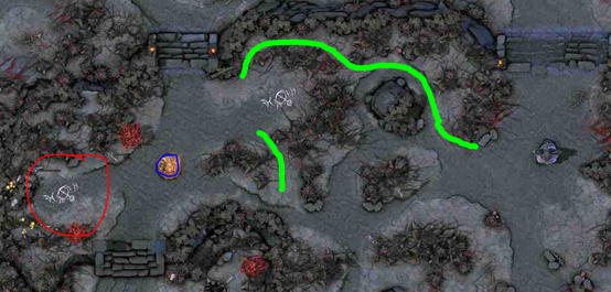 就位置来讲,这个圣坛几乎可以说是为3号位专设的,能够为混线打野提供很多便利,但是图中这条绿色通道却让天辉3号位的生存环境多了几分凶险。