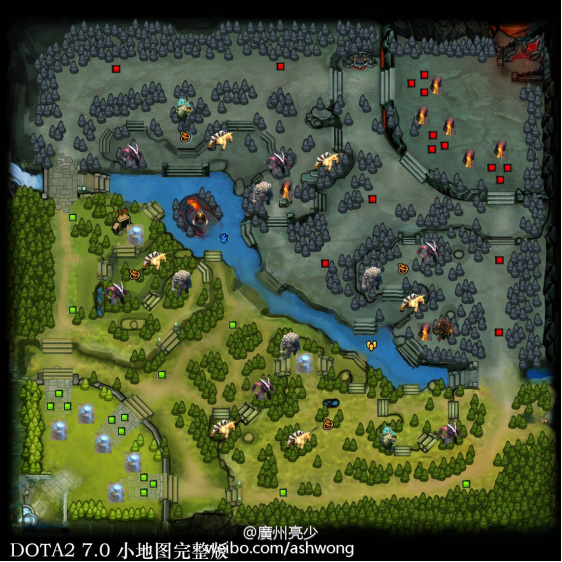最后再附上两张非常实用的图,第一张是@广州亮少制作的小地图完整版,能够很明显的看到塔、兵营、圣坛和野怪、符点的分布: