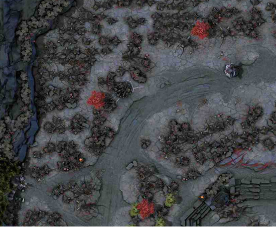 这片区域参照天辉也做了修改,就面积而言,这里地形更开阔一些,而且是一个十字路口,所以为了平衡,这里的树木少一些,视野更开阔。
