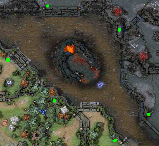 · 图中绿圈处增加了一个圣坛,每5分钟可以使用一次,激活后500范围内的英雄将在5秒内回复600血、200蓝(随游戏时间增加会增加);圣坛出兵时就是满的;圣坛不提供视野,也不会阻挡视野;双方高地各有5个圣坛