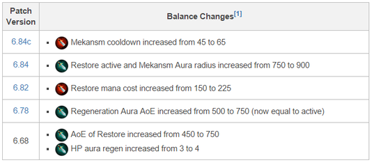 来看梅肯的历史改动。最近几个版本中梅肯并没有太多的变动,主要的变动就是蓝耗和CD的增加。150的蓝耗变成225针对的是潮汐、钢背这类力量型肉盾三号位。而CD45秒到65秒的变动则是放缓了拥有梅肯一方的节奏。别看只是20秒,相对于45秒的基数这个削弱几乎是增加了50%的时间。不管是推进还是打团找节奏,现在拥有梅肯一方的优势在一点点缩小。而对于以推进为主的前期阵容,这样的削弱是致命的 。于是我们就可以看到,在梅肯的冷却加长后PUSH阵容受到了极大的影响,尤其是对老陈这个英雄。以往老陈在20分钟左右推光6座外塔,在那之后拖家带口一波流站上别人的高地,如果对方的阵容输出不足,那等待他们的被平推的命运。