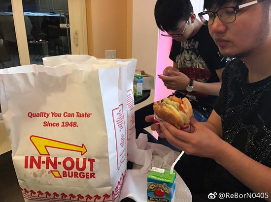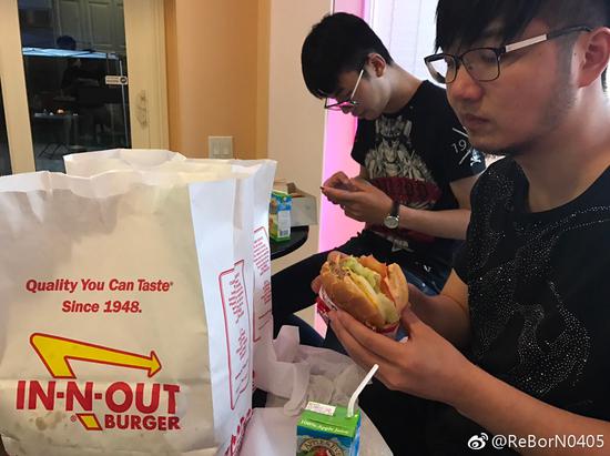 由于BTS的House在很偏很偏的郊区,原本我想赢了比赛给队员们点个饺子吃一下,结果试了3家店,都表示不在外卖范围!退而求其次,只能给队员们尝一下加州最有名的汉堡In-N-Out了,可能是时差还没完全适应,等汉堡到了的时候,大伙已经躺在椅子上睡起来了,更有甚者,直接往地上一躺了。