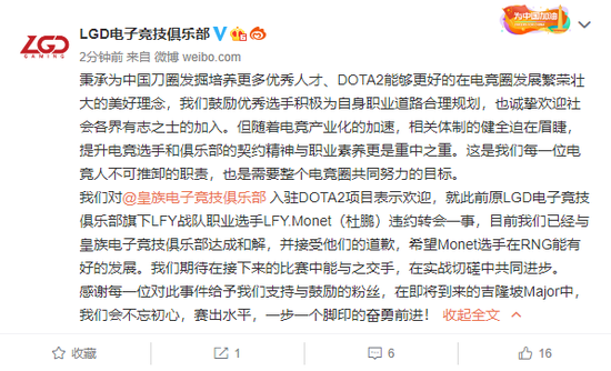 随后,LGD俱乐部也通过微博做出了回应。