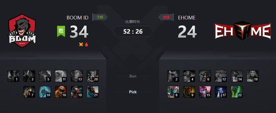 50分钟原本极度被动的BOOM ID在中路打了先手秒掉了神谕者和小黑,EHOME两人交出买活,NEC在逃亡中阵亡后也买活,骑虎难下的EHOME只能正面接团,人马小狗二度切入杀死买不活的小黑,比赛就此结束,BOOM ID 2-0拿下EHOME晋级胜者组第二轮。而EHOME也跟随RNG的脚步掉入了败者组,以他们现在的状态,在残酷的BO1败者组中,真的很难有机会杀回来了。