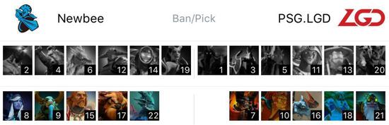 Newbee在天辉方,LGD在夜魇方。BP阶段LGD主要ban了热门的亚巴顿小强黑贤,Newbee则是连续ban团控,谜团猛犸冰龙统统ban掉。接着LGD抢下doom,Newbee则是直接抢掉小黑先知,LGD拿出蝙蝠想要线上压制。接着LGDban了保人的神谕和能和小黑配合的蓝猫,Newbee则是ban了比较克制小黑的冲脸斯温和电狗。接着LGD选出双头龙小娜迦的团战组合。Newbee则是全能牛头两个阵地战英雄。最后一手LGD继续ban了美杜莎拿了火枪增强输出能力,Newbee则是拿出中单TS。