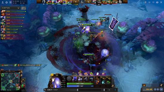 16分钟Liquid打掉肉山,TA带盾,VG集合过来想打,精灵白牛瞬间倒下,黑贤也被敌法大死,精灵买活回到战场,大圣收下残血冰魂人马自己被留,精灵飞机跑路。18分钟Liquid带着8K的经济优势和盾攻上上路高地,白牛先手大招留人,飞机大圣黑贤三大齐开连杀TA两条命,黑贤白牛死于乱军之中。