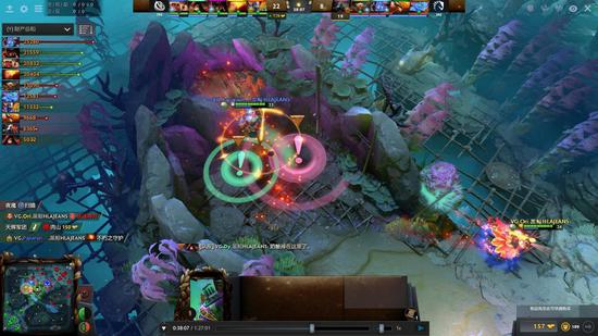 34分钟敌法在上路一个人打精灵飞机两个先杀精灵还要杀飞机,精灵买活VG全员过来终于留下了敌法。