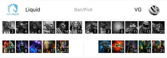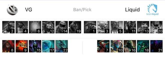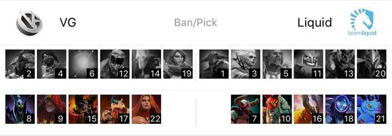 VG在天辉方,Liquid在夜魇方。双方前两手的选人都非常快,应该是提前想好的体系,VG最终是剑圣DP的双核加上人马土猫双冲脸,5号位墨客提供爆发和输出;风行人柱力选出了风行者,最后一选拿出大哥小鱼,马尔斯拉比克萨尔三兄弟打团也很强势。
