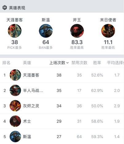 最后是英雄篇,也是重中之重!天涯墨客在震中杯Major的出场率最高,虽然国际邀请赛的预选赛有很多职业队选择火猫,但是墨客毕竟作为辅助可以一抢。而火猫如果一抢便要面临全员针对的情况,所以我选择了助攻和出场次数最多的是墨客。而禁用次数最多的英雄,个人感觉是骷髅王、火猫和斯温三选一。