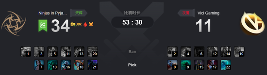 33分20秒,天辉NIP开雾杀掉了萨满和蓝胖后,双双买活,击杀掉了黑鸟。VG最终挡住了这波攻势。37分钟,黑鸟跳刀切入,白虎跟上秒掉潮汐蓝胖白虎超神,潮汐蓝胖双双买活。
