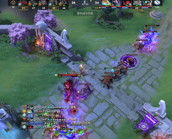 26分半EG于中路发起进攻杀死飞机大牛风行和小小,无奈之下飞机买活,EG回头拿下肉山,NiP大势已去,EG完成进一步压制,经济优势达到19k。