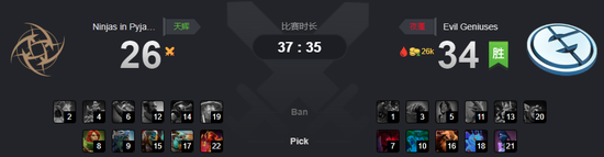 34分钟双方在夜魇下路野区爆发大战,第一时间火猫换掉了小娜迦,随后火猫买活,圣堂切掉了小小和风行,EG还是不想推,继续撤退打压制。37分钟EG在上路圣坛处团灭NiP全员后拿下这场比赛的胜利。