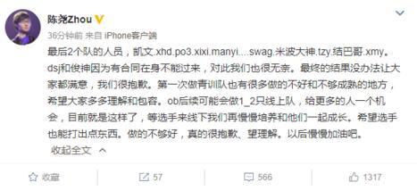 最后2个队的人员,凯文.xhd.po3.xixi.manyi....swag.米波大神.tzy.结巴哥.xmy。dsj和俊神因为有合同在身不能过来,对此我们也很无奈。最终的结果没办法让大家都满意,我们很抱歉。第一次做青训队也有很多做的不好和不够成熟的地方,希望大家多多理解和包容。ob后续可能会做1_2只线上队,给更多的人一个机会,目前就是这样了,等选手来线下我们再慢慢培养和他们一起成长。希望选手也能打出点东西。做的不够好,真的很抱歉、望理解。以后慢慢加油吧。