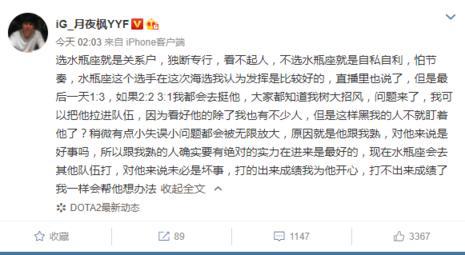 选水瓶座就是关系户,独断专行,看不起人,不选水瓶座就是自私自利,怕节奏,水瓶座这个选手在这次海选我认为发挥是比较好的,直播里也说了,但是最后一天1:3,如果2:2 3:1我都会去挺他,大家都知道我树大招风,问题来了,我可以把他拉进队伍,因为看好他的除了我也有不少人,但是这样黑我的人不就盯着他了?稍微有点小失误小问题都会被无限放大,原因就是他跟我熟,对他来说是好事吗,所以跟我熟的人确实要有绝对的实力在进来是最好的,现在水瓶座会去其他队伍打,对他来说未必是坏事,打的出来成绩我为他开心,打不出来成绩了我一样会帮他想办法