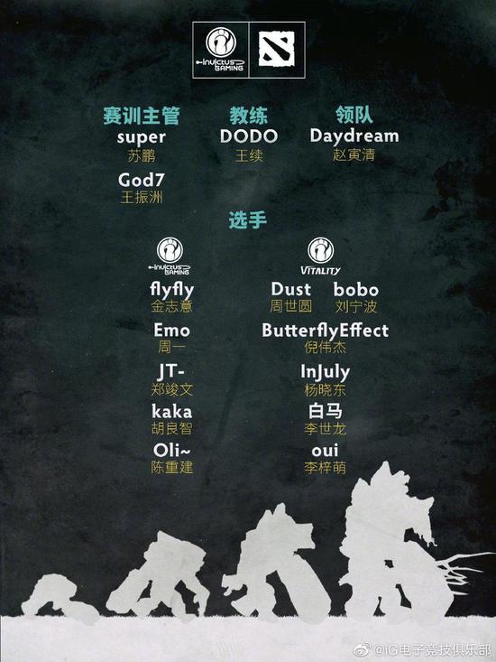在刚刚iG官方宣布了他们新赛季的阵容,其中iG仅做出了一项调整,即Kaka加盟替代了转会RNG战队的dogf1ghts;而Vitality队方面,队内的旧将Injuly再次回到了iG.V,同时也租借了许多年轻选手。以下是他们的官方公告: