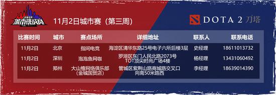 11月2日本周六,城市挑战赛DOTA2项目将来到北京、深圳和郑州,又会有怎样精彩绝伦的对抗等着我们呢?让我们拭目以待!