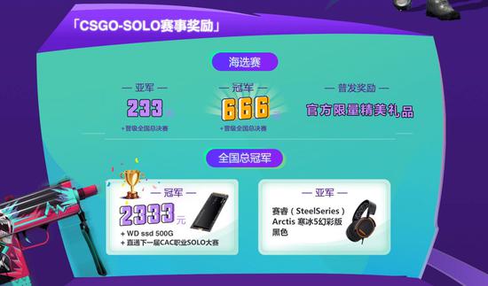 海选各站冠亚军将晋级全国总决赛,展开终极对决!全国总冠军奖金2333元,并获得由Western Digital赠出的500G SSD一块,全国亚军获得由赛睿(SteelSeries)赠出的Arctis寒冰5幻彩版黑色耳机一副!另外,重磅消息来了!DOTA2全国SOLO总冠军将直通下一届DAC主舞台,参与职业SOLO大赛,CS:GO全国总冠军将直通下一届CAC职业SOLO大赛!在国际大赛上与职业哥单挑,你与梦想只差一个SOLO路人王!