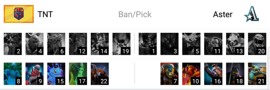 首场比赛,对线期过后TNT较为主动,NEC大招斩杀多次关键英雄,但经济并未拉开。前期节奏缓和下来,PA成功发育出BKB后Aster组织反攻,第一波团战完胜。随后的节奏一直掌握在Aster手里,发育良好的PA刀刀暴击。33分钟,Aster中路开雾,先杀冰女再杀瘟疫法师。其后,双方下路爆发团战,火猫换掉瘟疫法师帕克,小娜迦唱歌掩护撤退。Aster中路上高,双方单位阵亡后立刻买活,然而小娜迦买活死,猛犸也随之倒下,幻刺暴走!TNT打出了GG。