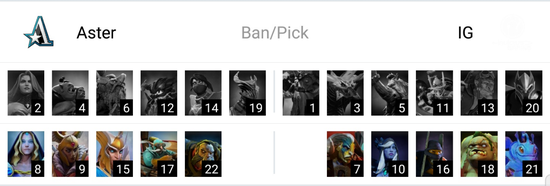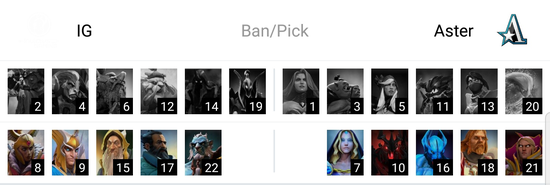 首局比赛,线上Aster发育更好,但iG在puck到六后连起两波节奏后通过人头的钱将经济追评。对线期结束后,两边互有往来。狼人经济一枝独秀,军团的经济则是有点脱节。20min,iG开雾来中打了Aster一波四人团灭后将经济差拉开到了3K。25min,两边在河道雾对雾后iG打出完美团,iG用小y的性命换掉Aster四人,随后iG控盾经济差来到了6K。之后的比赛iG完全掌控了局势,28min,iG在轻松拆掉Aster中路高地后经济差来到了1w4。32min,iG在中路抓到狼人又追死飞机后Aster自知翻盘无望直接敲出GG。iG先下一城。