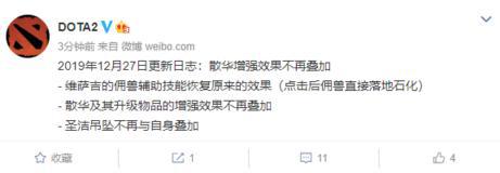 12月27日:散华增强效果不叠加 2019-12-27 14:39 新浪游戏 0 在刚刚,Dota2进行了一个80M的更新,以下是更新日志: 维萨吉的佣兽辅助技能恢复原来的效果(点击后佣兽直接落地石化) 散华及其升级物品的增强效果不再叠加 圣洁吊坠不再与自身叠加