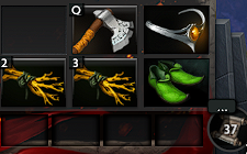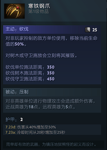 如果对线有一定优势,也可以选择狂战斧刷钱,打经济压制,有了跳树的机动性,刷钱速度不亚于敌法师,在13,4分钟可以做出来狂战斧,再补一个连击刀就是2分钟的事情,然后速度补BKB能打能刷。