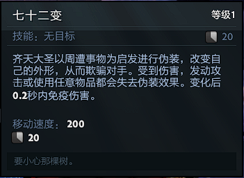 此技能有一定的迷惑能力,还可以躲技能,但是不要过分依托此技能躲伤害,CD长且失误率较高,不过多多练习找一下感觉,是可以轻松躲掉丽娜的大,lion大,蓝猫残影的,但是只能躲避技能的伤害不能躲技能伤害的附带效果,比如女王的毒镖可以躲避第一段伤害,后续的伤害还是有的。在变形状态下若受到伤害会变回原形,被敌方追杀时,如果敌方没有AOE技能释放,大圣可躲进树林变成树,迷惑敌方再跳树逃生,变成树后,除非敌方A你的单位,不然A地板也找不到你的。