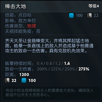一个小爆发和小控制的技能,俗称板,配合三技能被动能打出一个很不错的爆发,此技能是一个直线技能,对施法有一定的要求,释放不好容易板空,且技能CD22s很长,释放技能之前要想好目的是留人还是打伤害,此技能配合3技能吸血,板的单位越多,回血效果越好,若是对线的时候打出被动,板人加兵可瞬间满血,让大圣能站住线。此技能根据普攻加暴击算伤害,可触发物品效果如电锤暗灭。