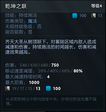大圣的位移技能,加天赋后具有极强的切入和逃生能力,也是大圣刷钱的主要技能,可选择蓄力,蓄力时间越长减速时间越长伤害越大,前期带2个小蓝可实现一直用此技能刷钱,刷钱速度很可观,需要注意的是,在树上敌方是无法看得到你的,但是如果敌方破坏树木,大圣从树上掉下来,会被原地眩晕4秒,即使开bkb也是要被眩晕,所以跳树的时候一定注意是否有敌方视野。