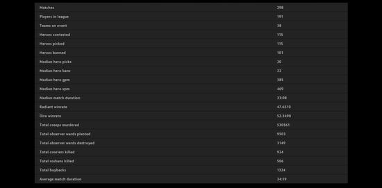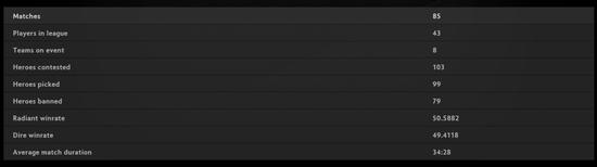 突出一个“干!干!干!”在天辉胜率57.3%和夜魇胜率42.6%差距如此巨大的情况下,说明中国队伍在于天辉方时更利于发挥自己的战术和扩大优势并以此奠定自己胜利的基础。中国赛区在各个赛区是当前版本中游戏节奏最快的地区,平均比赛时间为31:43分也非常好的说明了这一点。