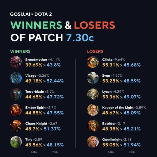 Dota2在DOTA PIT邀请赛结束以后迎来了7.30c的版本更新,不出意外的话,7.30c将会是第十届国际邀请赛的比赛版本。在本次更新中,弱势的英雄得到了增强,强势的英雄遭到了削弱。但是有的英雄即便增强了也上不了比赛的舞台,例如育母蜘蛛。本期数据统计包含了7.30c中胜率提高最多和胜率降低最多的英雄。