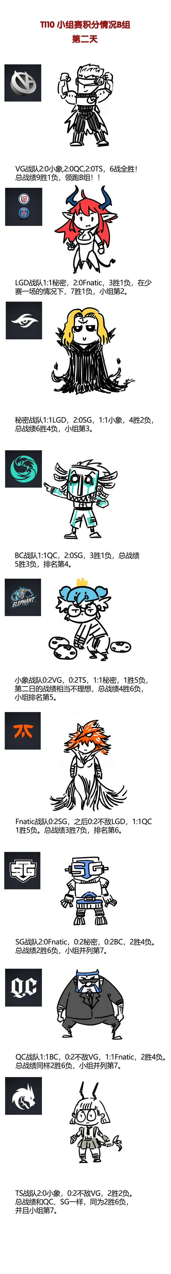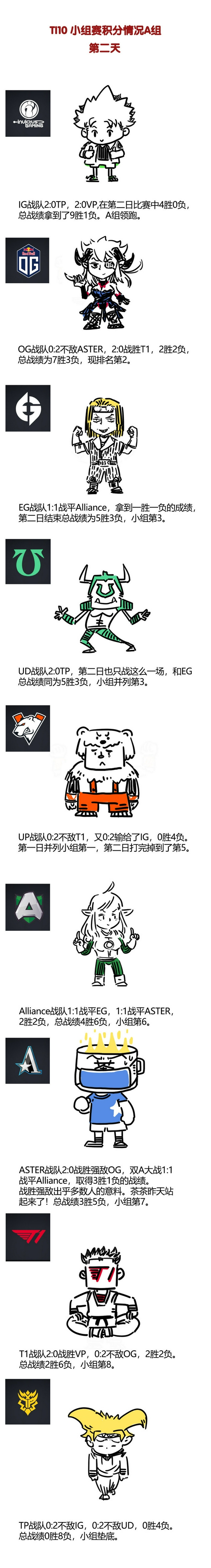 TI10小组赛第二天结束后,小组积分情况如下图。A组2支中国战队IG继续领跑,ASTER出人意料的战胜强敌;B组3支中国战队VG豪取6胜,在多赛一个BO2的情况下领先LGD,领跑B组,小象昨天发挥不是很理想,6场比赛只拿下了1场。详细排名可看下图。