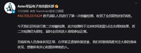 在刚刚Aster战队发布了消息,昨日Aster战队人员进行的核酸结果为全员阴性,今天晚些时候会得出第二次核酸检测的结果,若第二次检测仍为阴性即可进入场馆参加正赛。