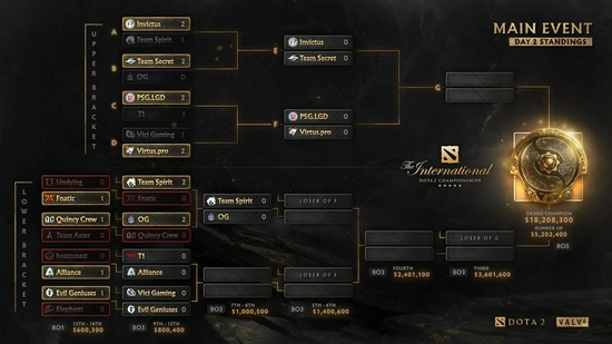 TI10主赛事第二日。胜者组:PSG.LGD 2-1战胜T1挺进胜者组半决赛。而VG 1-2不敌VP遗憾落入败者组;败者组:Spirit速战速决,2-0轻松击败Fnatic挺进下一轮。而OG 2-0 QC。Sumail将自己的挚爱亲朋,手足兄弟YawaR送到了登机口。