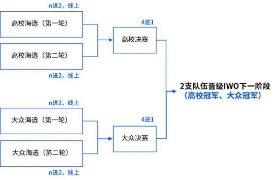 大众组海选分为2轮,每轮海选在4强前均采用BO1赛制,进入4强后采用BO3赛制;两轮共选出4支队伍晋级大众决赛,大众决赛采用BO3,最终大众组冠军战队进入IWO预选赛。比赛全程为淘汰赛制。