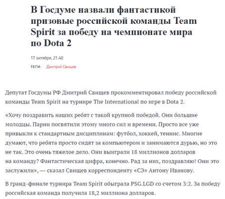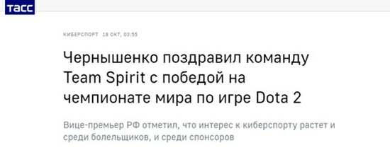 在早些时候,俄罗斯联邦副总理德米特里·切尔尼申科、国家杜马体育文化委员会成员德米特里·斯维切夫等俄罗斯政要以及俄罗斯国家足球队、著名球星亚历山大·戈洛温等体育界人士也曾发文祝贺Team Spirit赢得TI10冠军。
