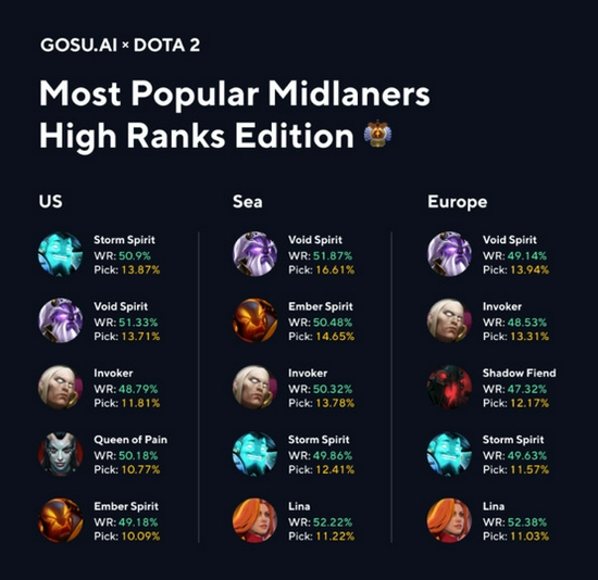 随着第十届国际邀请赛结束,版本7.30c也被玩家们摸了个透。在最近的数据统计中记录了不少来自美国服务器、东南亚服务器和欧洲服务器的中单玩家所使用的英雄及其胜率,汇总了一份高分局里热门的中单英雄排行榜。