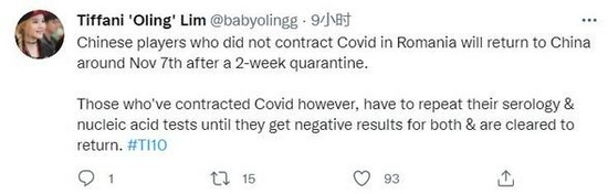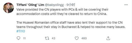前Titan战队的经理Oling TI10期间在罗马尼亚现场担任翻译,她在个人推特中更新了中国战队的情况。选手们回国的日期将和个人身体状况有关,期间的住宿费用由V社提供,华为罗马尼亚办事处也提供了很多帮助。