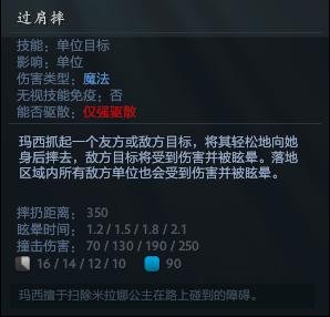 玛西抓起一个友方或敌方目标,将其轻松地向她身后摔去,敌方目标将受到伤害并被眩晕。落地区域内所有敌方单位也会受到伤害并被眩晕。