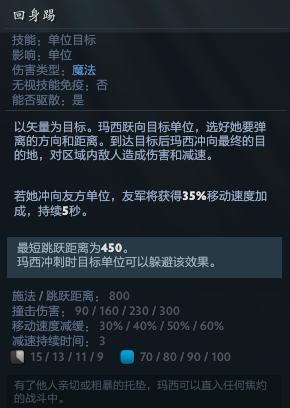 以矢量为目标。玛西跃向目标单位,选好她要弹离的方向和距离。到达目标后玛西冲向最终的目的地,对区域内敌人造成伤害和减速。若她冲向友方单位,友军将获得35%移动速度加成,持续5秒。