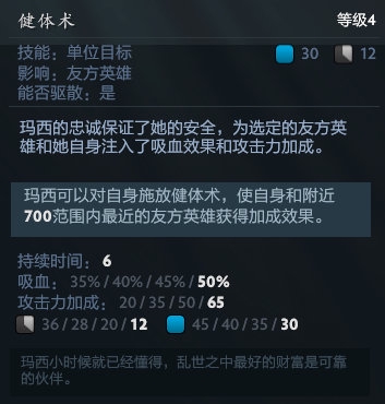 1. 在游戏进行到中期团战时,玛西的攻击力逐渐升高。此时健体术的65攻击力就并没有那么关键了,健体术持续时间只有6秒,更应该把他当做一个撒旦来用。学习了技能免疫天赋之后也可以把他当做一个救人道具来用。