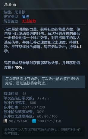 玛西释放潜藏的力量,获得狂怒的能量点数,使自身可以发动快速的打击。每次狂怒连技的最后一击都会创造一个脉冲效果,对目标周围的敌人造成伤害,并降低移动速度和攻击速度,持续2秒。在狂怒连技的间隔,玛西无法攻击,持续1.5秒。玛西施放怒拳破时获得弱驱散效果,并且移动速度提升15%。