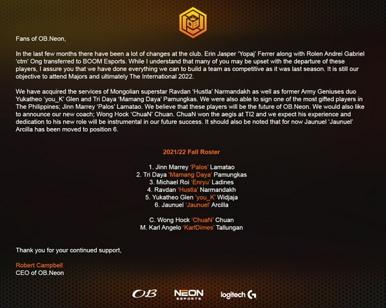 我们签下了来自蒙古的新星Hustla以及前AG战队的双子星Mamang Daya和you_K。我们还签下来菲律宾选手Palos。我们相信这些选手将是OB.Neon的未来,同时,在此宣布我们的新教练:ChuaN。ChuaN曾在2012年国际邀请赛上捧起冠军神盾,我们希望他的经验和他所扮演的新角色可以帮助我们。同时,还应注意Jaunuel现已被下放。