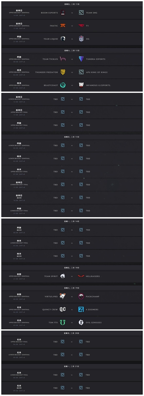 赛程对阵现已在Dota电竞专题中列出,而梦幻阵容的锁定截止日期马上到来:北京时间2月11日上午8:00(周五)。 务必要赶快决定好最终的人选。
