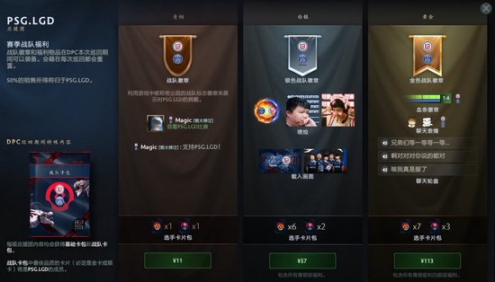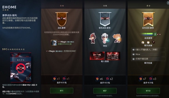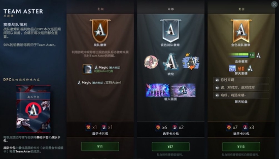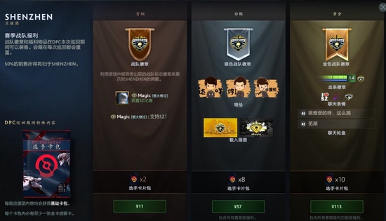 Valve官方更新了诸多战队的应援包,其中中国区的战队包括EHOME战队、PSG.LGD战队、Aster战队、SHENZHEN战队和XG战队。购买青铜等级的应援包可以获得战队标志徽章,购买白银等级的应援包可以在青铜应援包的奖励基础上额外获得银色战队徽章、喷绘和载入画面,而购买黄金等级的应援包则可以在白银应援包的奖励基础上额外获得金色战队徽章、血条徽章、聊天表情和聊天轮盘。