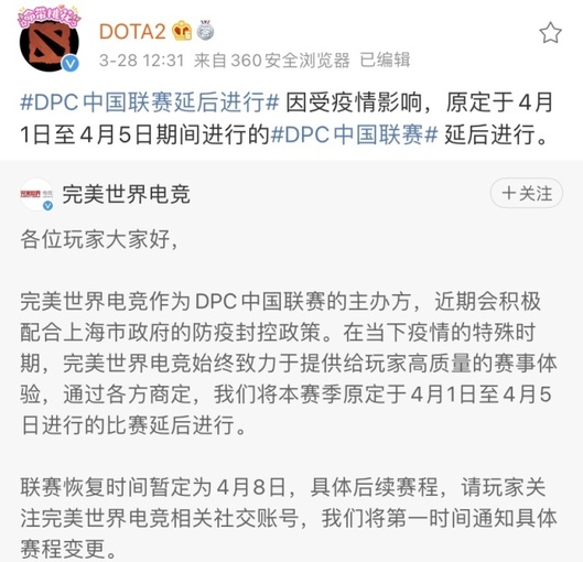 原定于4月1日DPC中国联赛延后 2022-03-29 23:39 新浪游戏 0 由于近期上海疫情原因,以及上海市政府的防疫封控政策,DPC中国联赛的主办方,完美世界电竞宣布推迟4月1日-4月5日的DPC中国联赛,目前联赛恢复时间暂定为4月8日。 4月1日-4月5日被推迟的赛程如下图: