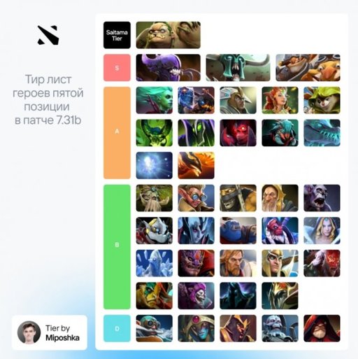 Team Spirit的四位选手在给出了自己位置的英雄强度排行榜后,队伍的队长兼五号位选手Miposhka也给出了他的五号位英雄强度排行榜: