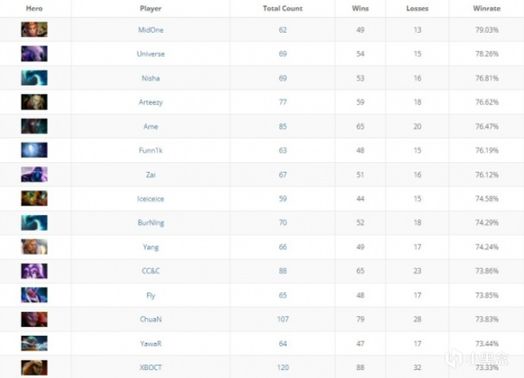 中国赛区的Ame(恐怖利刃85场76.47%)、BurNing(水人70场74.29%)、Yang(全能骑士66场74.24%)也入选了这个榜单。